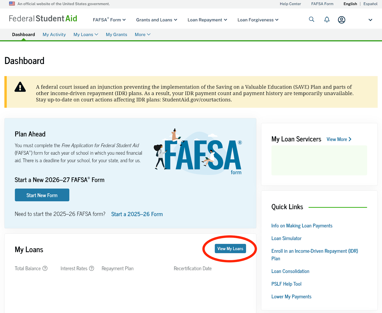 You should then see this dashboard screen. You'll click on "View My Loans", which is circled here in red: