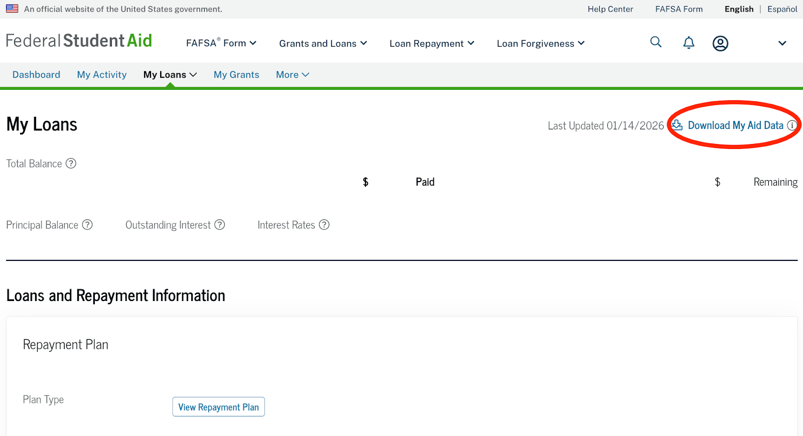 You'll then see this My Loans screen, and you can click on "Download My Aid Data" in the upper right corner, circled in red. If using a mobile device, rotate your phone horizontally to see this option.