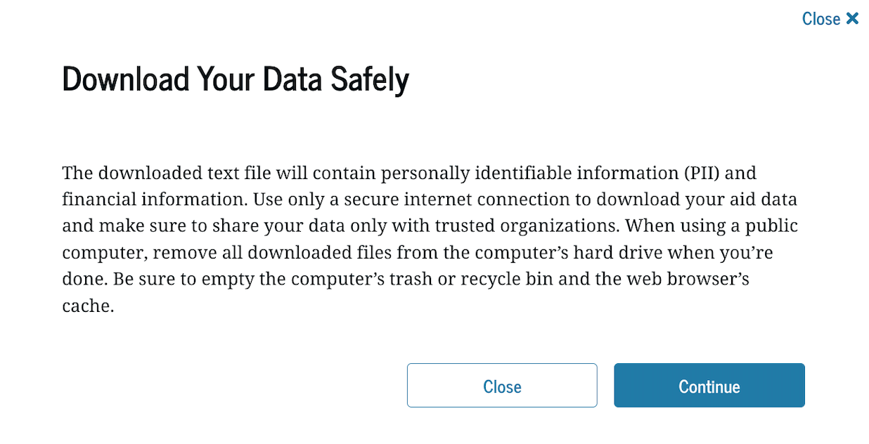 Next, you'll click "Continue" in this pop-up window. A file called "MyStudentData.txt" will automatically download, and you can upload this file to Summer.